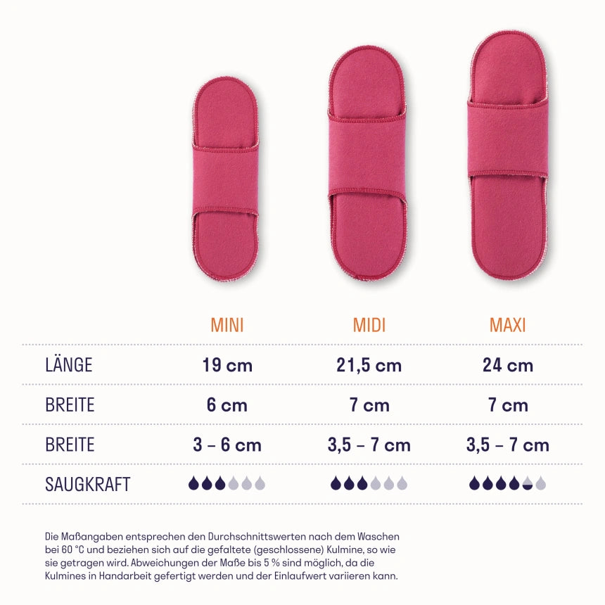 Saugstark, sicher und hautfreundlich. Die wiederverwendbaren Binden von Kulmine haben einen Saugkern aus Bio-Baumwoll-Molton oder -Flanell. Sie sind geeignet für leichte bis starke Blutungen und leichte Formen von Inkontinenz. Ihre Saugkraft ist vergleichbar mit der von Einwegprodukten. Der hochwertige Bio-Baumwoll-Flanell der äußeren Lagen nimmt Blut und Urintropfen schnell auf, ohne dass sich die Stoffbinde feucht anfühlt.