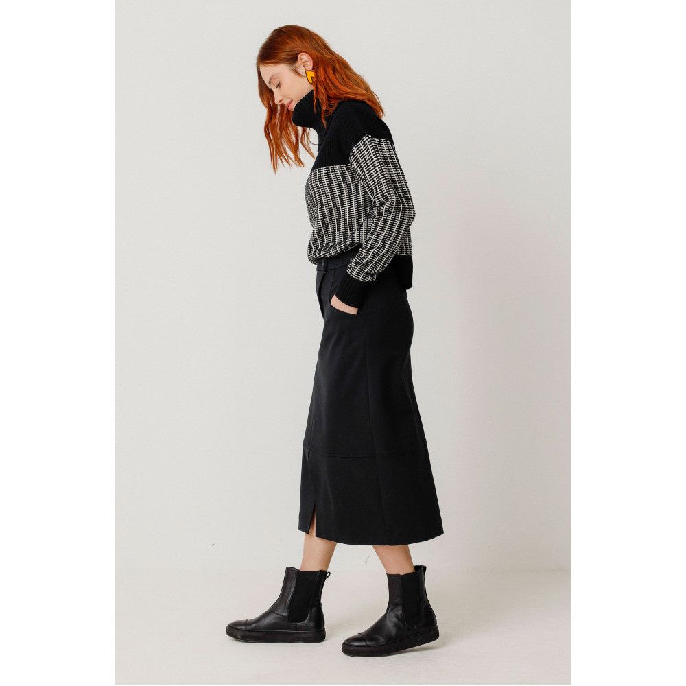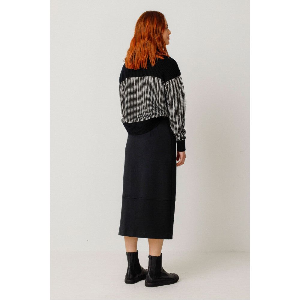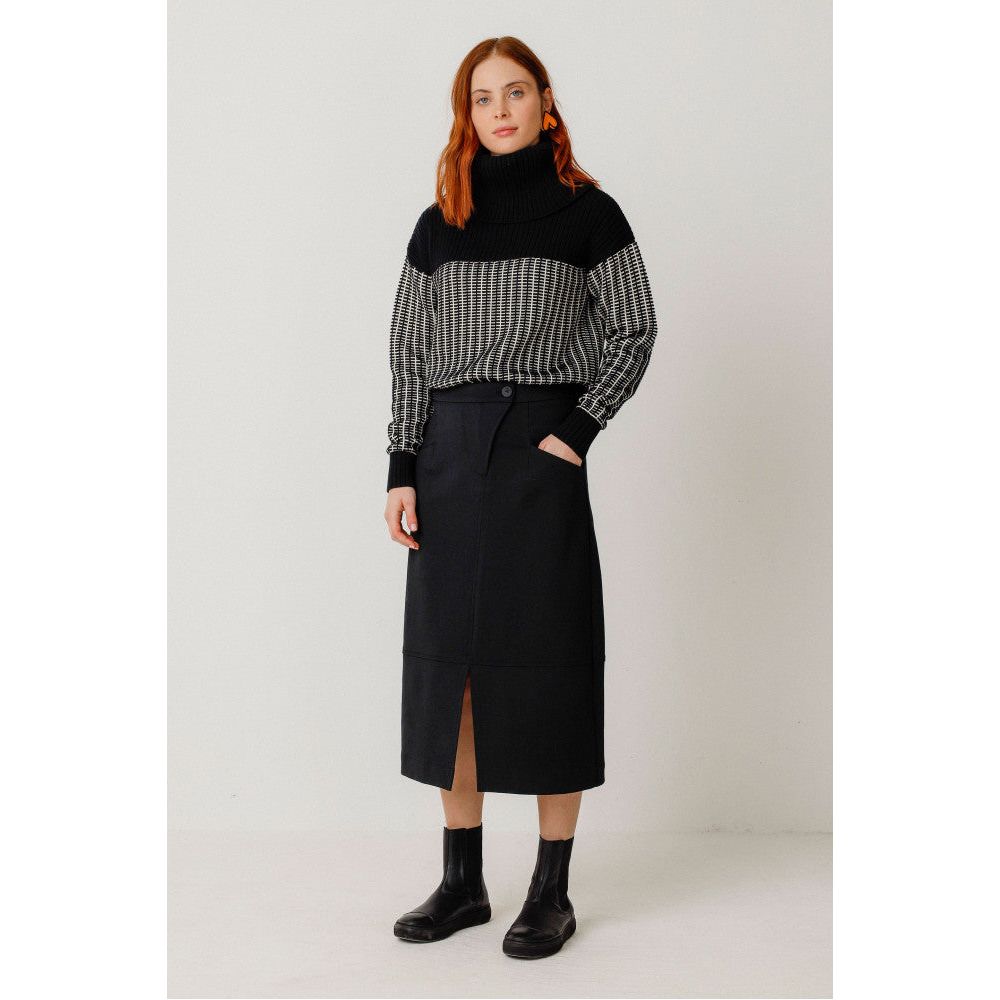 Zweifarbiger Strukturpullover mit Trichterkragen und langen Ärmeln.