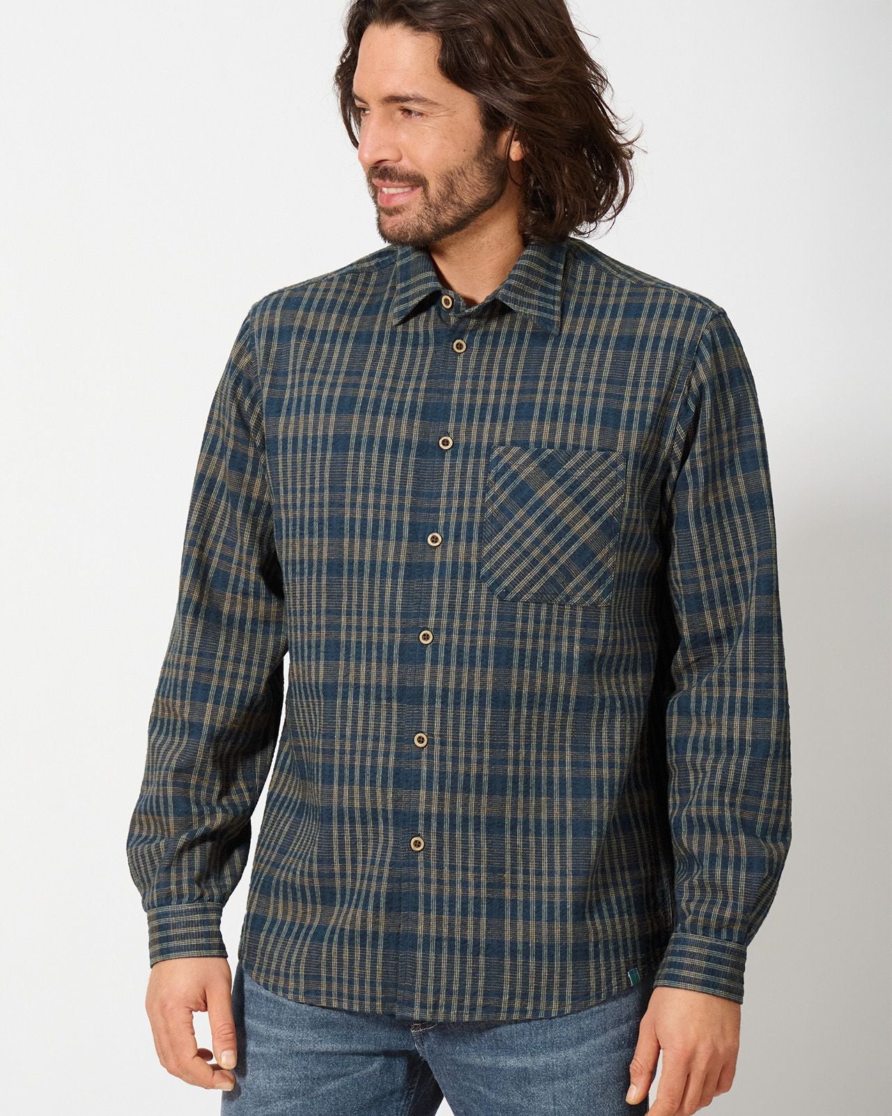 Das feine, erdig gestreift-karierte Muster mit Seersucker-Effekt und die Kokosknöpfe verleihen diesem zuverlässigen Alltagsbegleiter einen naturnahen, kernigen Look.