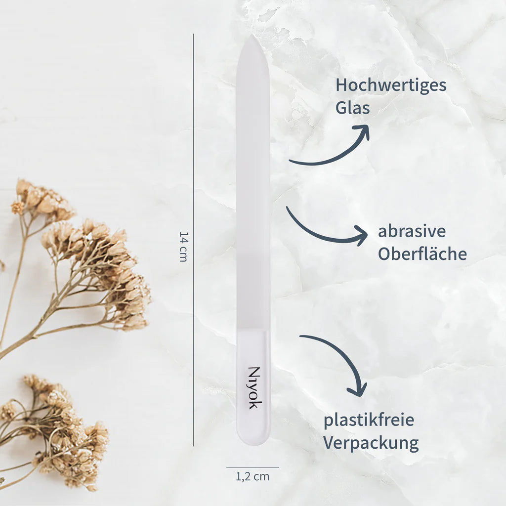 Mit der nachhaltigen Glasnagelfeile von Niyok bringst du deine Nägel schonend in die gewünschte Form. Unsere feine Glasnagelfeile ermöglicht splitterfreies Glätten der Nägel und von rauen Kanten, sodass deine Nägel immer sauber und gepflegt sind. Aufgrund der Oberflächenstruktur der Nagelfeile werden die Nagelkanten gleichmäßig und glatt versiegelt.