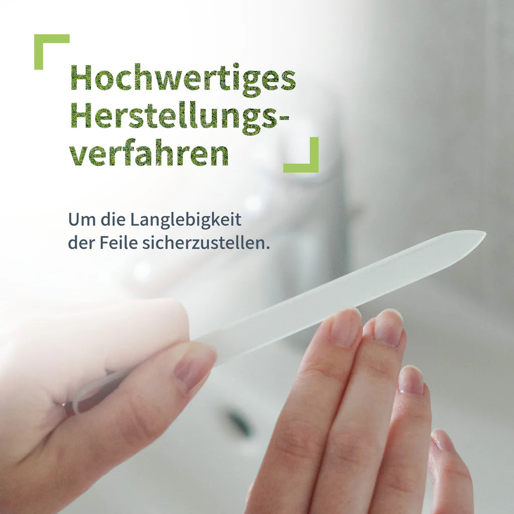Bei unserer Glasnagelfeile wird ein hochwertiges Herstellungsverfahren angewandt, um die Langlebigkeit der Feile sicherzustellen. Die abrasive Oberfläche der Glasnagelfeile wird durch chemisches Ätzen hergestellt. Aufgrund dieser Herstellung ergeben sich die mikroskopisch kleinen Schleifelemente unmittelbar aus dem Körper der Glasfeile. Die Schleifelemente sind scharf, gleichartig und auf der Oberfläche gleichmäßig verteilt. Auf diese Weise stumpft und nutzt sich die Schleiffläche durch den Gebrauch nicht ab. Zudem lassen sich aufgrund der Schleifelemente die Nägel schonender feilen und es entstehen keine kleinen Risse.