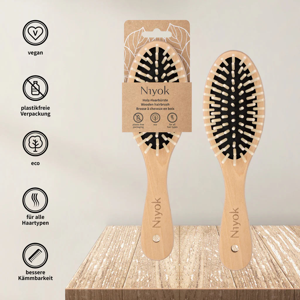 Die große Holzbürste von Niyok eignet sich für das Styling von jedem Haartypen - egal ob glatte oder lockige Haare. Die großen Holznoppen entwirren schonend das Haar und beseitigen jegliche Knötchen. Die Holznoppen sorgen nicht nur für ein angenehmes Gefühl auf deiner Kopfhaut, sondern stimulieren auch sanft bei jeder Bürstenbewegung. Das fördert die Durchblutung und kann das Haarwachstum anregen – ein echter Wellness-Moment für dich und deine Haare! Diese einzigartige Kombination aus Pflege und Styling ist perfekt, um deine Haare glänzend und geschmeidig zu machen. Durch den ergonomischen Griff liegt die Bürste angenehm in der Hand und lässt sich leicht durch das Haar führen.