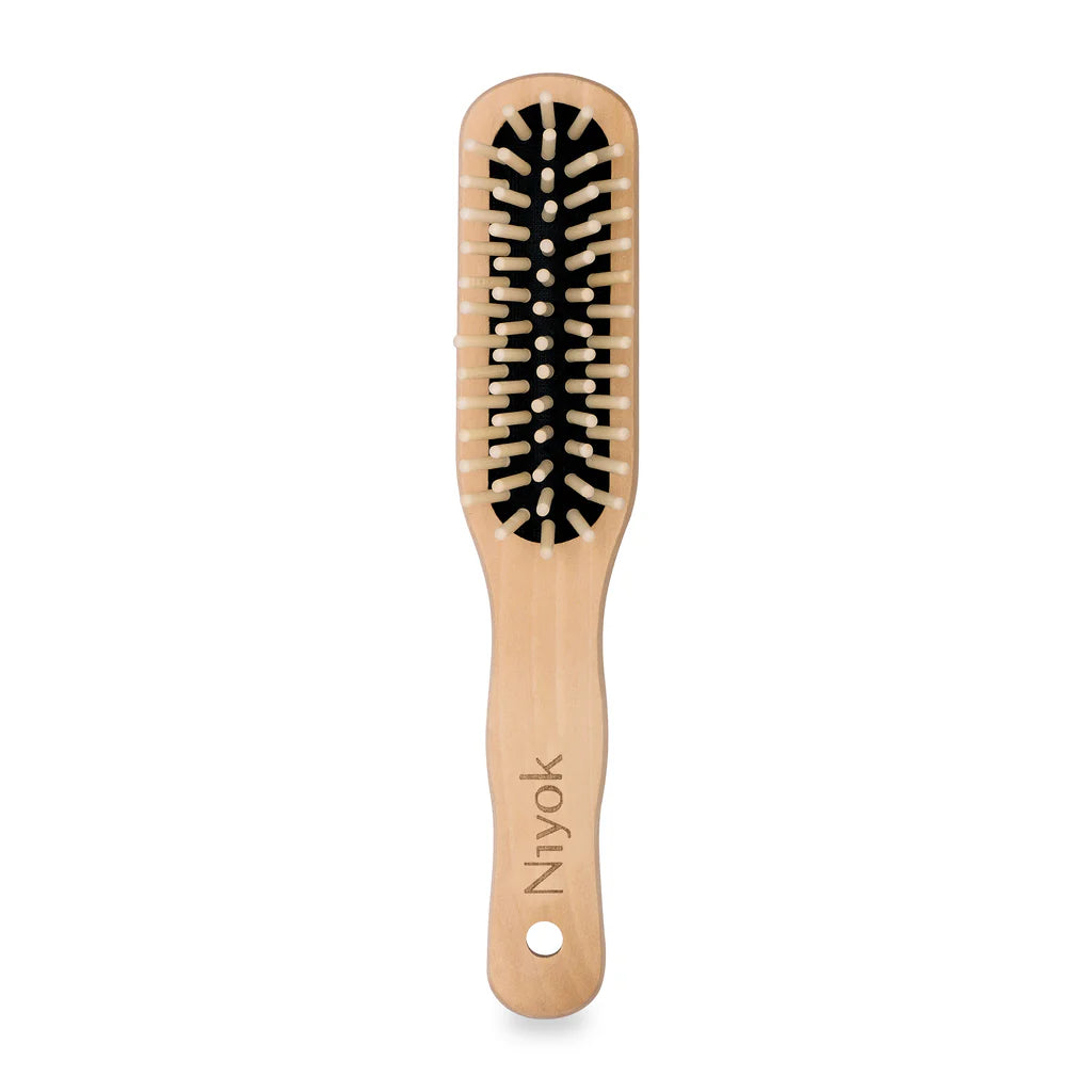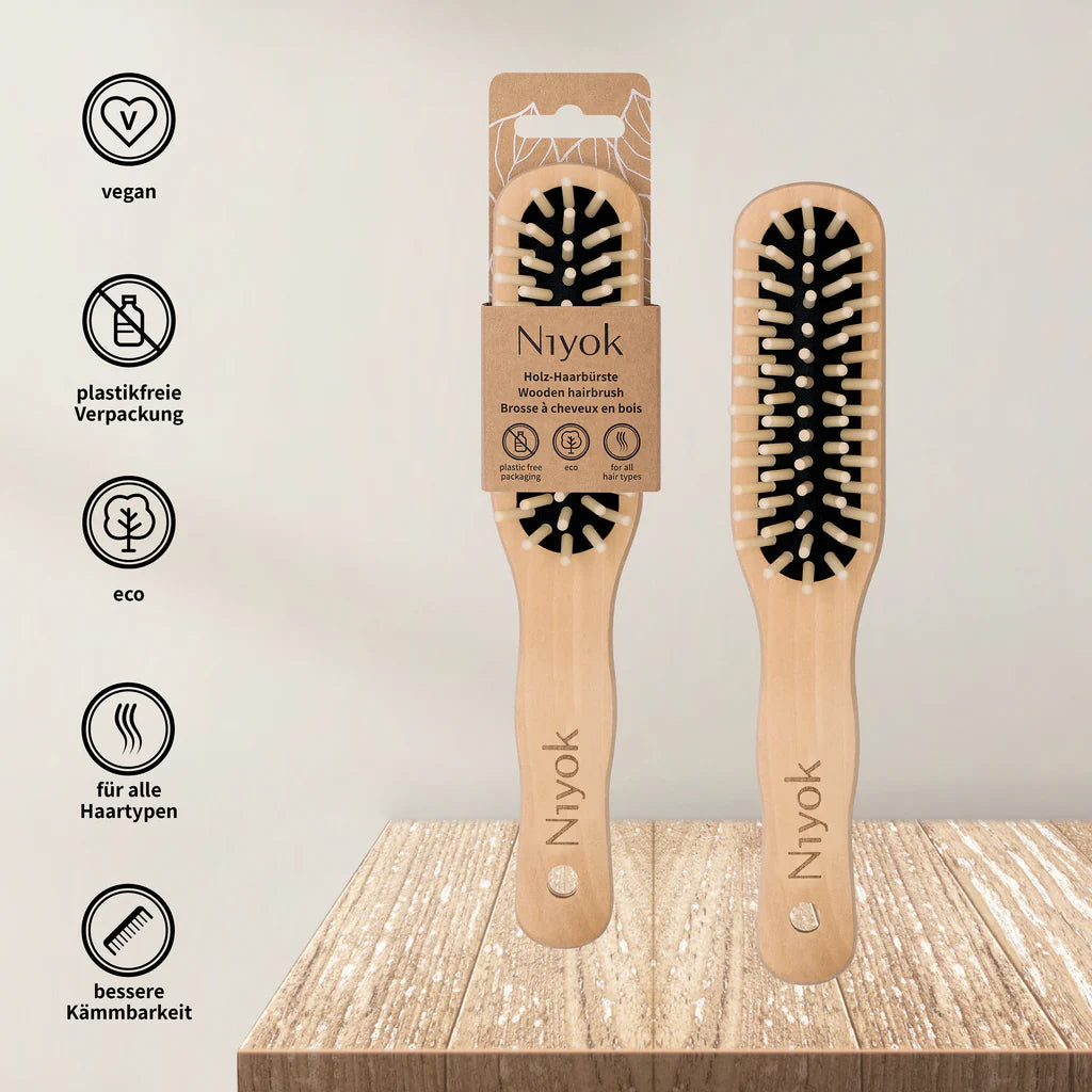 Die längliche Holzbürste von Niyok ist ein hochwertiges Stylingprodukt, speziell konzipiert für langes Haar und zum Föhnen von Volumen. Ihr ergonomisches Design ermöglicht eine komfortable Handhabung und präzises Styling. Die längliche Form hilft dabei, das Haar an den Wurzeln anzuheben und Volumen über die gesamte Haarlänge gleichmäßig zu verteilen. Die großen Holznoppen entwirren schonend das Haar und beseitigen jegliche Knötchen. Die Holznoppen sorgen nicht nur für ein angenehmes Gefühl auf deiner Kopfhaut, sondern stimulieren auch sanft bei jeder Bürstenbewegung. Das fördert die Durchblutung und kann das Haarwachstum anregen – ein echter Wellness-Moment für dich und deine Haare!