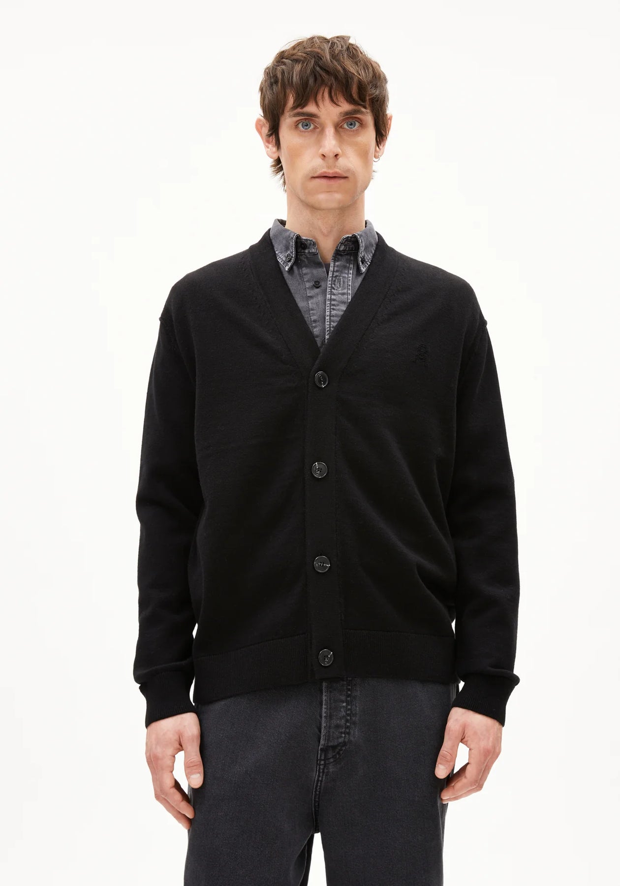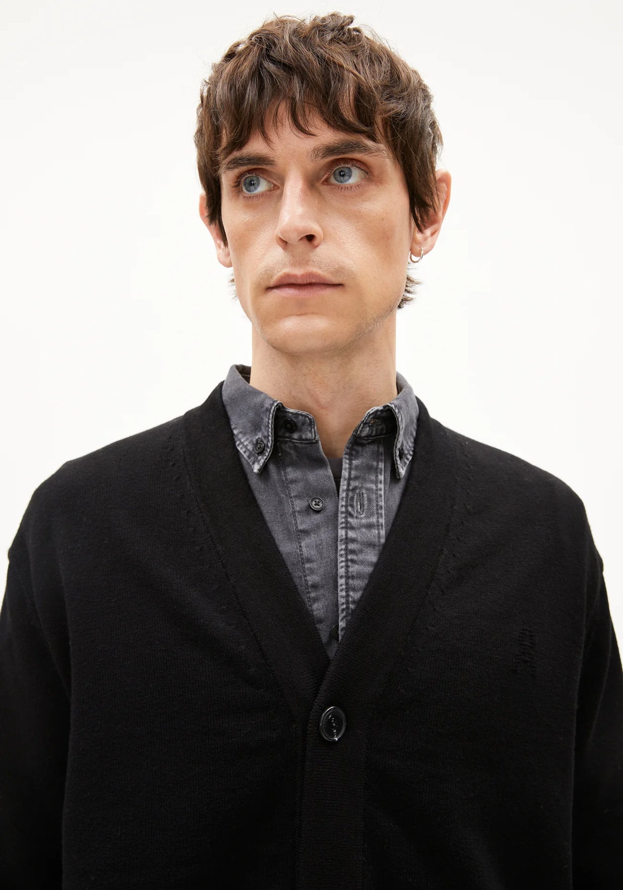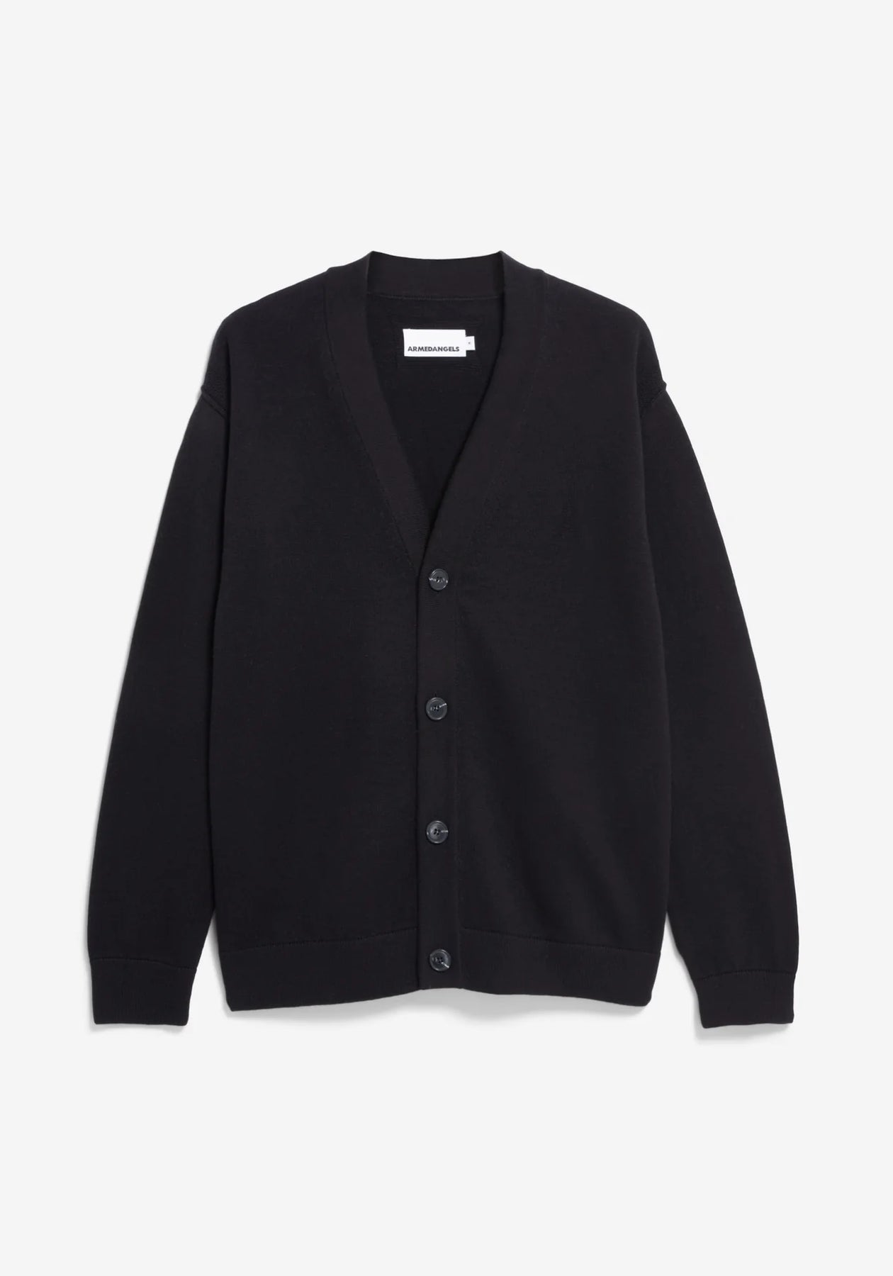 Unser AANATOL Strick Cardigan aus Feinstrick hat einen tiefen V-Ausschnitt und eine Knopfleiste. Er kombiniert Bio-Baumwolle und Wolle für ein weiches Gefühl und eine lässige Passform.